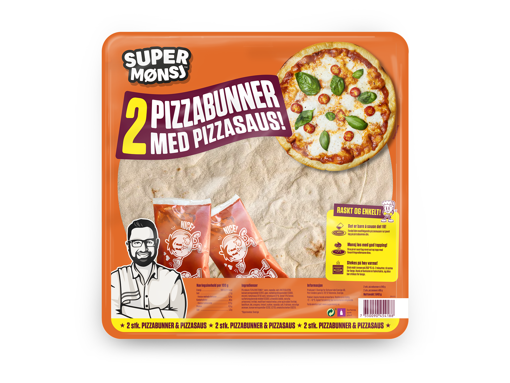 Pizzabunn 75 % (HVETEMEL*, vann, rapsolje, salt, HVETEGLUTEN, konserveringsmiddel (E281), gjær, melbehandlingsmiddel (E300), enzym), tomatsaus 25 % (vann, tomatpuré 22 %, tomat 11 % (tomat, surhetsregulerende middel (E330)), urteeddik (eddik, naturlig urtearoma), hvitløk, modifisert maisstivelse, urter og krydder (hvitløk, basilikum, løk, oregano, timian), sukker, rapsolje, salt, fruktose, naturlige aromaer, konserveringsmidler (E202, E270), smaksforsterker (E621)).